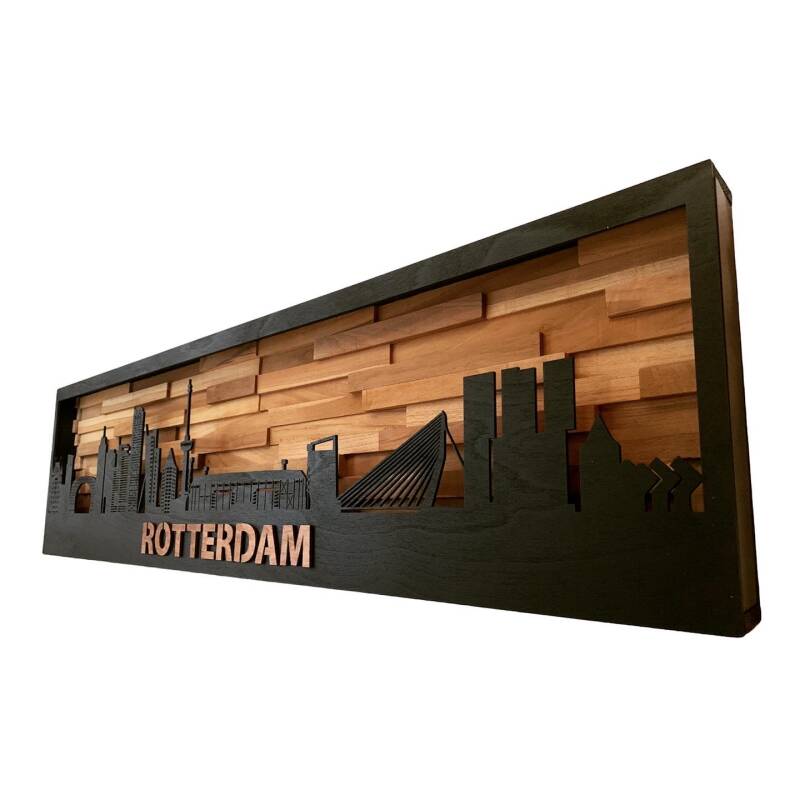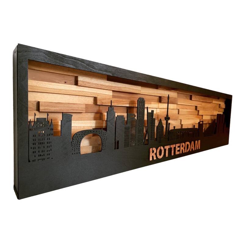 Een collega van mij bij Drukwerkdeal was enorm enthousiast over wat ik zoal maakte voor Martstijl. Na een t-shirt besteld te hebben vroeg hij na enkele weken of ik ook de skyline van Rotterdam in een "woodwork varant" kon maken voor zijn schoonvader, een rasechte Rotterdammert.